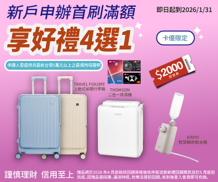 活動期間:2026/1/1~2026/1/31線上申請,並於申請日期後45天內完成核卡