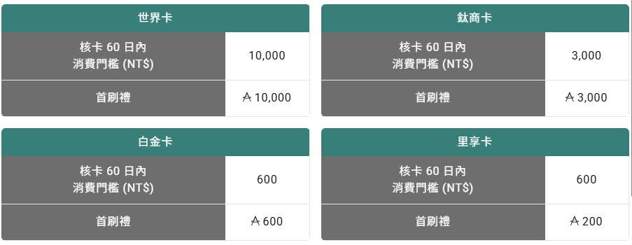 2025/12/10-2026/12/31持卡人於新卡核卡後60日內,以新卡累計一般消費金額達以下消費門檻,並繳交全額首年年費,即享首刷禮!(里享卡首年免年費)
