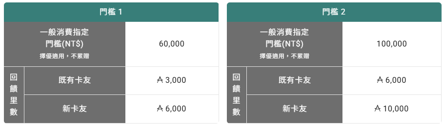 2025/12/10-2026/2/28正卡持卡人於活動期間內一般消費累計達指定門檻,並完成活動登錄,既有卡友最高再享 6,000 里數,新卡友最高再享 10,000 里數!