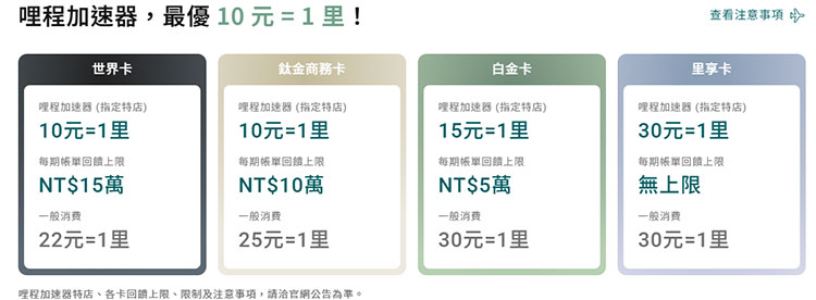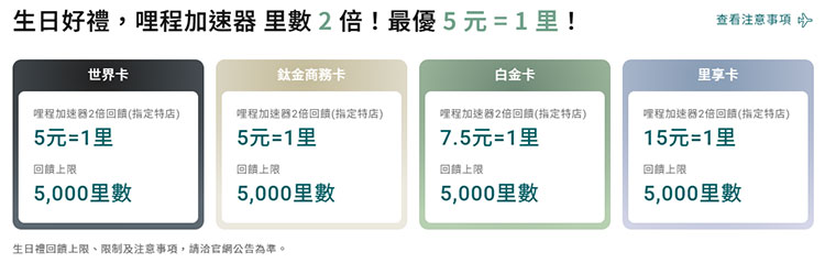 一般消費:30元=1哩;生日當月里程加速器消費享2倍回饋