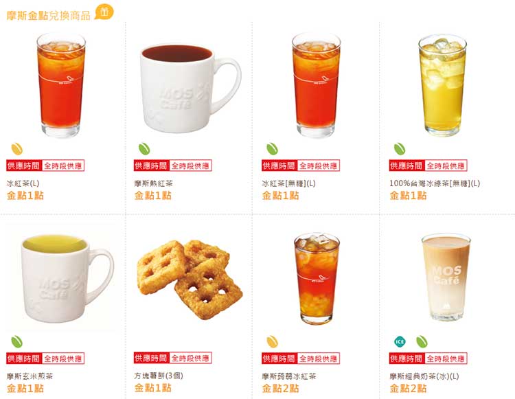 1點摩斯金點可兌換冰熱摩斯咖啡中杯、小薯或方塊薯餅一份,2點則可兌換番茄芝士蛋堡、抹茶紅豆米派等,可查詢摩斯漢堡金點兌換表。
