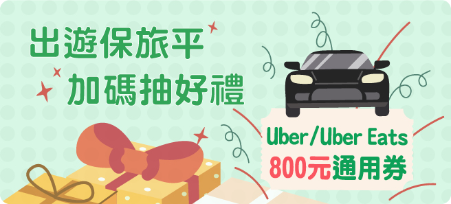 活動期間內於富邦產險官網完成投保「旅平險」,且總保費達1,500元以上,免登錄即可抽「Uber/Uber Eats通用券800元」1張。