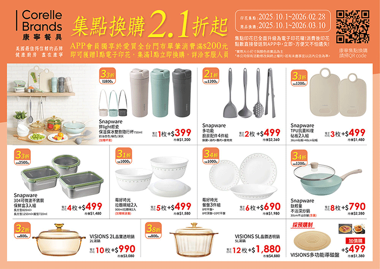 2025/10/1~2026/03/10愛買推出集點加價換購活動,APP會員於愛買消費滿200元集1點電子印花,即可用點數加價換購康寧系列餐具。