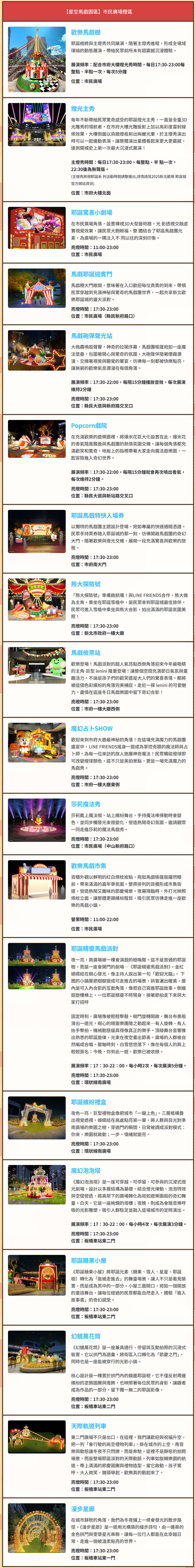 ■主燈秀時間:11/14(五)起 市府大樓北面,每日17:30-23:00,每整點、半點一次,22:30後為無聲版。(主燈秀將視耶誕系列活動時間調整播出, 詳情請見2025新北歡樂耶誕城官方網站資訊)