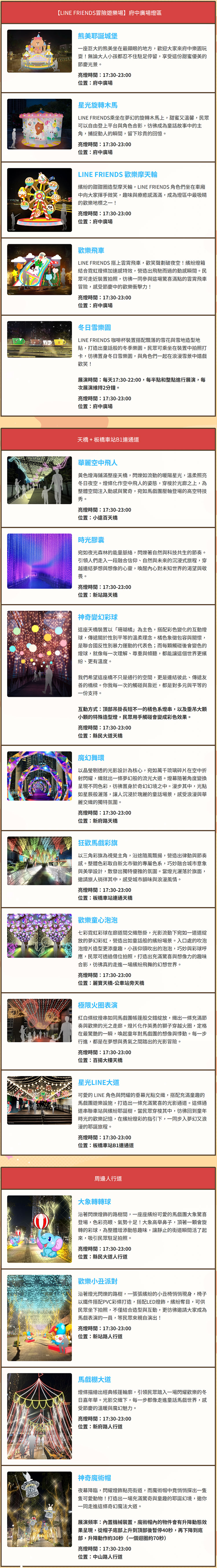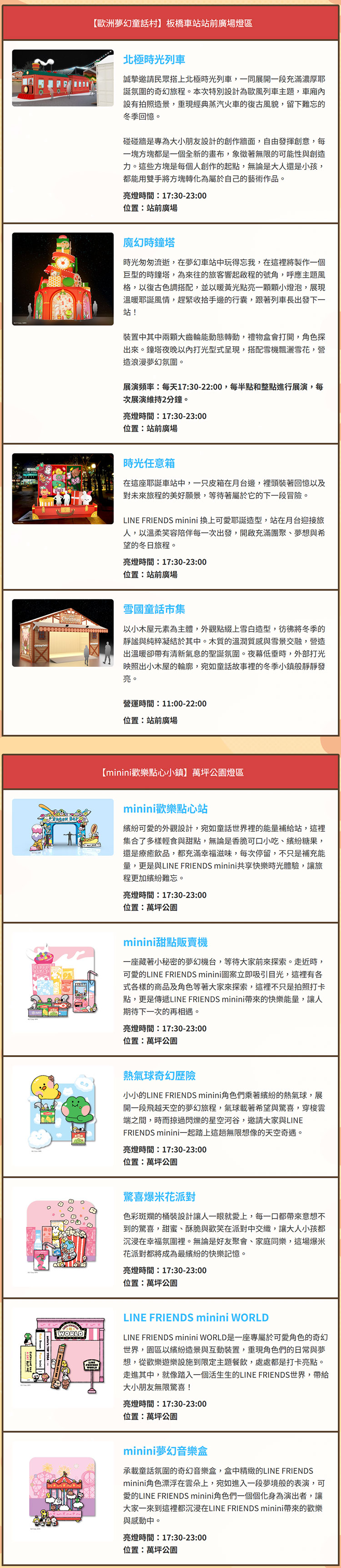 亮點四:全球知名 IP!LINE FRIENDS & LINE FRIENDS minini新北全燈區總動員-可愛的LINE FRIENDS熊大、熊美、莎莉、兔兔與minini夥伴們lenini、salini、bnini現身燈區,打造限定版耶誕造景與打卡點。