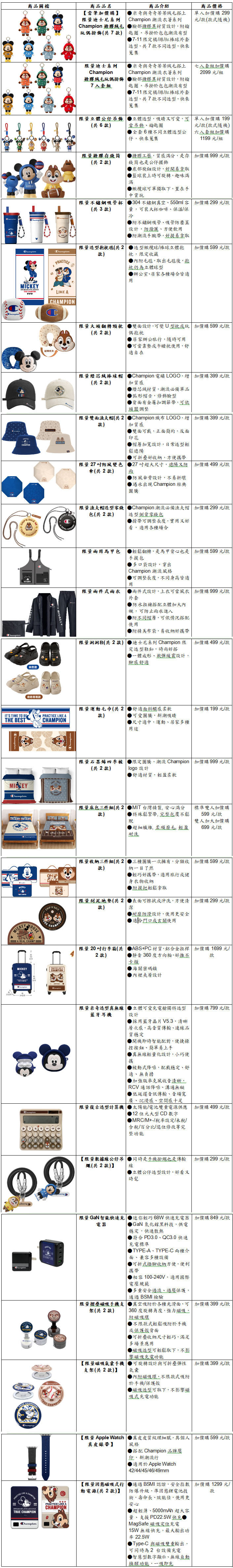 7-ELEVEN肖像精品再掀話題,「迪士尼跨界潮流Champion」系列自11月5日下午3點起展開全店精品集點活動,邀請迪士尼人氣當家角色米奇與淘氣兄弟檔奇奇蒂蒂換上美式潮服,首度結合全球知名運動時尚品牌Champion,推出包括搪膠絨毛玩偶、搪膠公仔存錢筒、穿搭配件、家居寢具到3C周邊超過50款生活精品。11月5日凌晨0點起亦同步推出會員當筆購活動,凡uniopen會員在門市消費、繳費或寄/取件,即可以299元購買限量版「迪士尼系列 Champion搪膠絨毛玩偶掛飾」,共7款造型,款式隨機,不僅有米奇、奇奇蒂蒂搭上Champion潮流服飾,臉部採搪膠異材質、搭配短絨毛設計並附鑰匙圈,更有7-ELEVEN限定橘、綠、紅三色搭配「7」與「11」號碼棒球外套造型,超級粉絲可於下午3點用整組2,099元直接帶回家收藏!