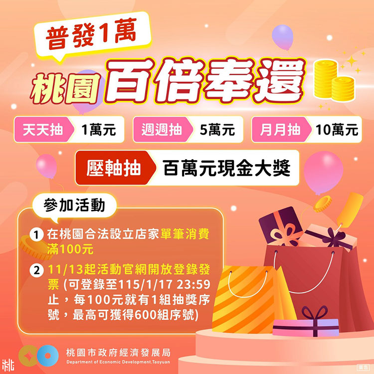 全民普發現金1萬元陸續入帳,桃園加碼推出「桃園百倍奉還」消費抽獎活動,不僅天天抽1萬,壓軸最大獎還將抽出100萬元。活動期間從11月12日至12月31日,發票登錄時間從11月13日開始至2026年1月7日,只要活動期間在桃園消費、開立發票,登錄消費發票就能參加抽獎活動,天天抽、週週抽、還有百萬壓軸大獎抱回家。參加方式以下小編會詳細介紹~