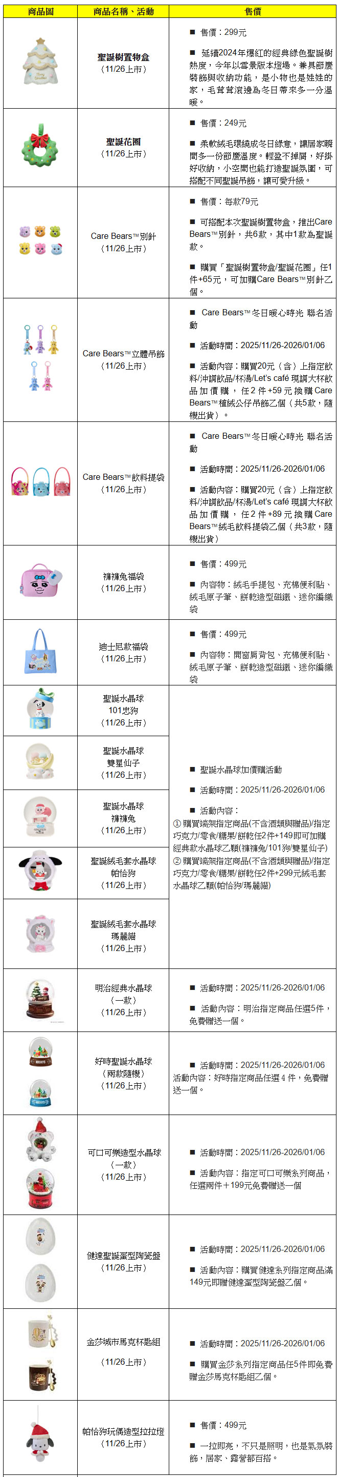 今年「全家」集結帕恰狗、101忠狗、瑪麗貓、雙星仙子、褲褲兔等超人氣角色,推出多款節慶限定水晶球,消費者只要購買端架指定商品(不含酒類與贈品)或指定巧克力、零食、餅乾、糖果任兩件,即可加價149元帶回經典款水晶球(褲褲兔/101忠狗/雙星仙子),或以299元入手絨毛套水晶球(帕恰狗/瑪麗貓)。