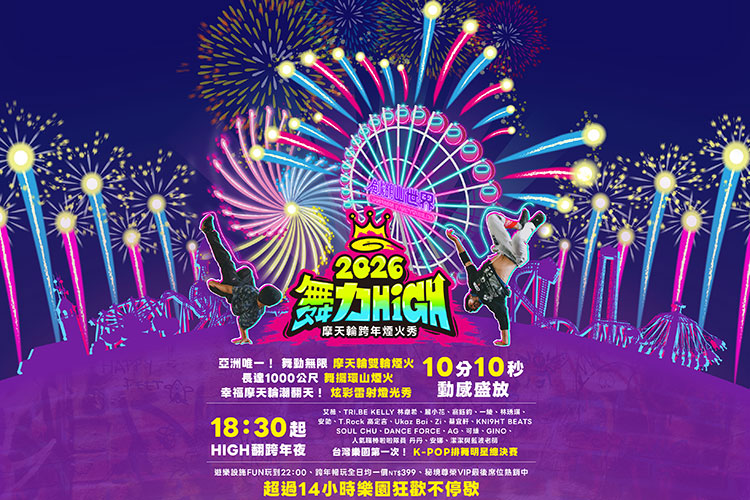 ■演唱會卡司:以「舞力最厲害,有你才夠High!」為主題,推出亞洲唯一的摩天輪跨年煙火秀,並首度舉辦樂園K-Pop排舞大賽。由知名主持人GINO、可緁領軍,攜手艾薇、TRI.BE KELLY 林韋希、麗小花、翁鈺鈞、一綾、林琇琪、安勍、T.Rock 高定言、Ukaz Bai、Zi、蔡宜軒、KNI9HT BEATS、SOUL CHU、DANCE FORCE等實力派演出者輪番上陣。此外,人氣職棒啦啦隊員丹丹、安娜、潔潔以及舞蹈名師藍波老師也將親臨現場,與現場民眾一同倒數,迎接2026年的到來。
