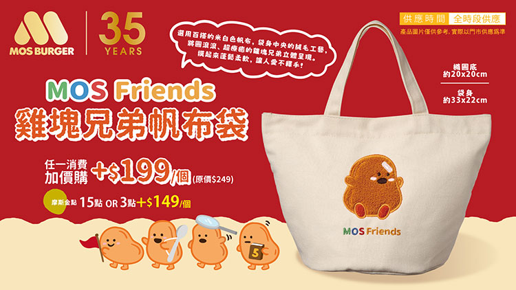 任一消費加價199元可收藏「雞塊兄弟帆布袋」,摩斯漢堡會員另可獨享以金點15點免費兌換,或使用金點3點加價149元把超人氣「雞塊兄弟帆布袋」帶回家。1月下旬起,來門市消費不限金額另加價88元,就能入手小巧可愛的「MOS Burger招牌小燈箱」,採吸磁設計,可吸附於辦公室隔板或冰箱上,發光效果完美呈現迷你 MOS Logo,顏色更應景春節。