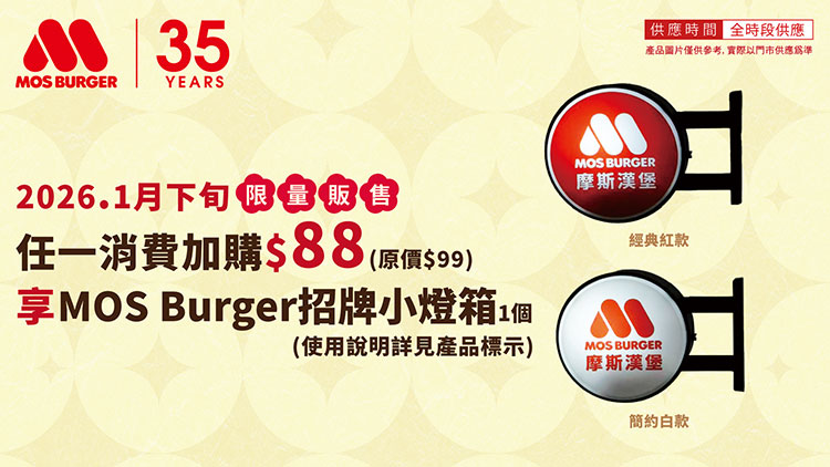 摩斯漢堡自1月8日至2月16日 推出限量「MOS Burger招牌小燈箱」與「雞塊兄弟帆布袋」加價購活動。針對年節送禮,MOS特別設計馬年限定摩斯卡,卡面以金馬奔騰為主視覺,寓意「一馬當先」與「金馬招財」,由視覺直接傳遞新春的吉祥祝福,整體設計典雅大氣,是年節餽贈親友的首選。