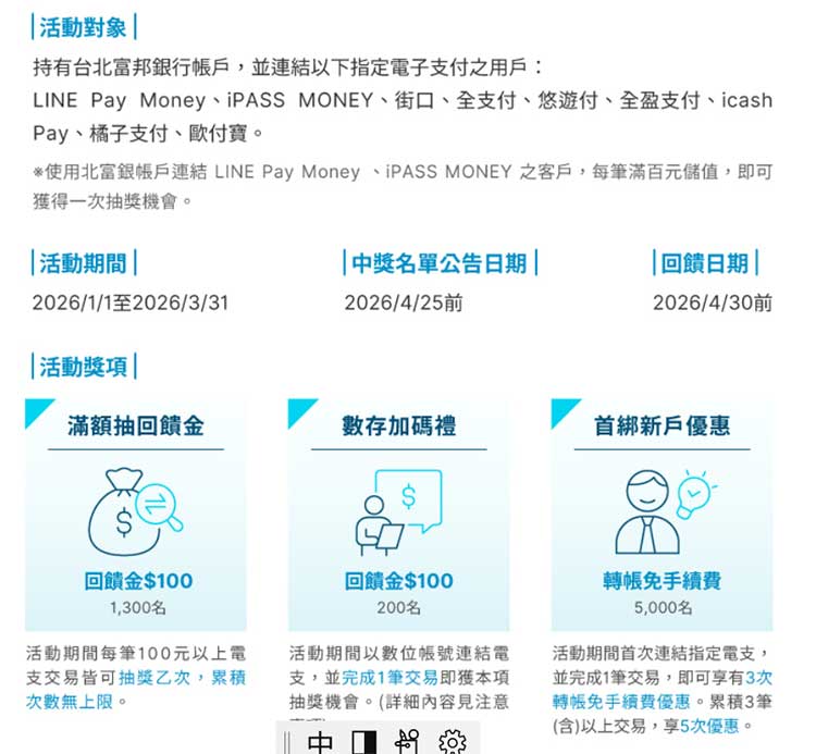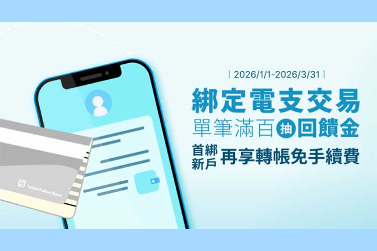 2026/1/1~2026/3/31以台北富邦帳戶綁定指定電子支付,並透過該帳戶完成100元以上單筆交易(含直接扣款消費或繳費),每筆皆可獲得一次回饋金100元抽獎機會,累積次數無上限;以數位帳戶交易再抽加碼獎項100元。