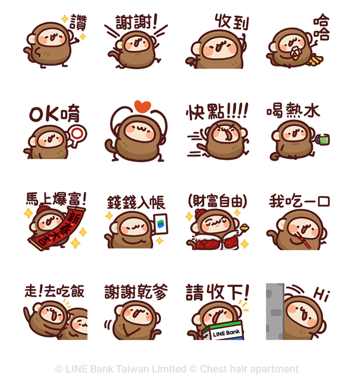 農曆新年倒數計時中,LINE Bank(連線商業銀行)與LINE原創貼圖知名創作者「胸毛公寓」的猴子朋友,春節前推出16款靜態貼圖「胸毛公寓的猴子朋友 限定款:招財加持版」,針對大家過年最需要的「招財、拜年、轉帳」情境設計,即日起加入LINE Bank官方帳號可免費下載使用180天。