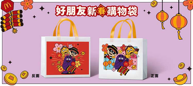 ※Facebook得獎名單將於2026年2月23日公告在麥當勞Facebook粉絲專頁貼文下方。若因資料錯誤致無法傳遞訊息,將視同放棄抽獎與得獎資格,獎項不再進行遞補。得獎者可獲得「好朋友新春購物袋 」1個,共5名。