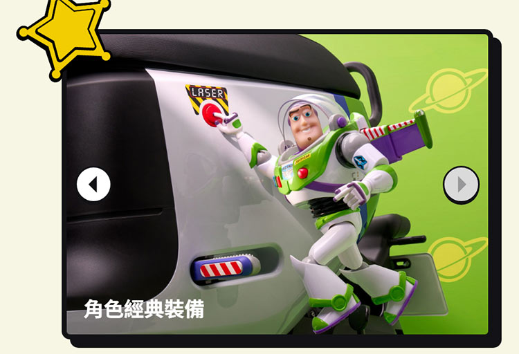 浩瀚宇宙號(巴斯光年):車前有玩具總動員徽章,車側有經典雷射按鈕與外旋踏板角色圖樣。
