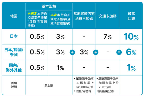 ※日韓泰加碼活動僅需登錄一次即符合當季活動資格,不需每月重覆登錄(ex.1月登錄成功,1月~3月之日韓泰實體消費皆符合活動資格)