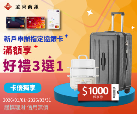 活動辦法:新戶於活動期間透過卡優網專屬連結進入遠銀官網申辦快樂信用卡,核卡後次月底前(含卡片寄送時間),新增一般消費滿NT$6,000(含)以上,可獲得卡優限定首刷禮(三選一)