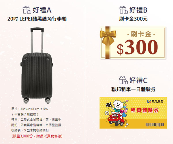 ▶▶聯邦M卡》刷保費1.2%、指定旅遊交通享6%回饋,新戶申辦贈行李箱