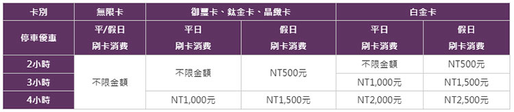 ※微風聯名卡停車優惠每卡每日每車限使用1次,每日最多以4小時為限,以出場時間為主。