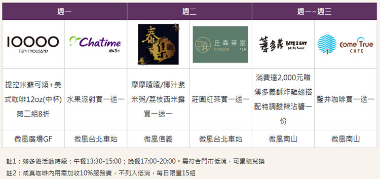 每週一至週三憑微風積點禮遇會員持聯名卡於微風指定餐廳/櫃位享專屬優惠。