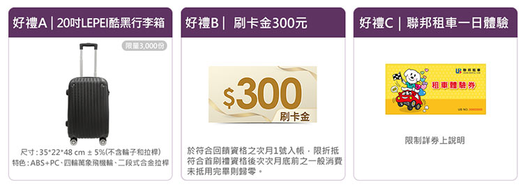 ▶▶卡優專屬申辦這張信用卡,新戶享旅狐28吋上掀式行李箱、智慧瞬熱飲水機、環保除濕機、1800元四選一