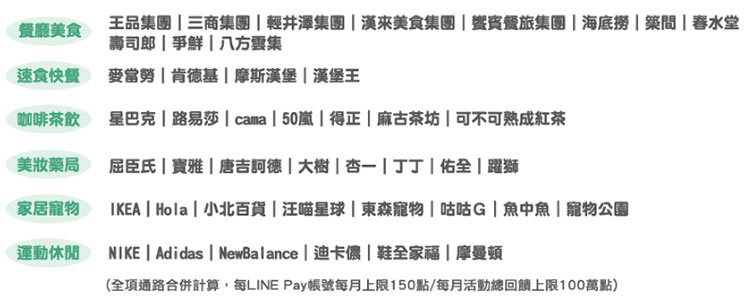 超市/賣場:楓康超市、喜互惠、美廉社、家樂福、愛買、全支付綁卡消費通路(全聯及大全聯)。