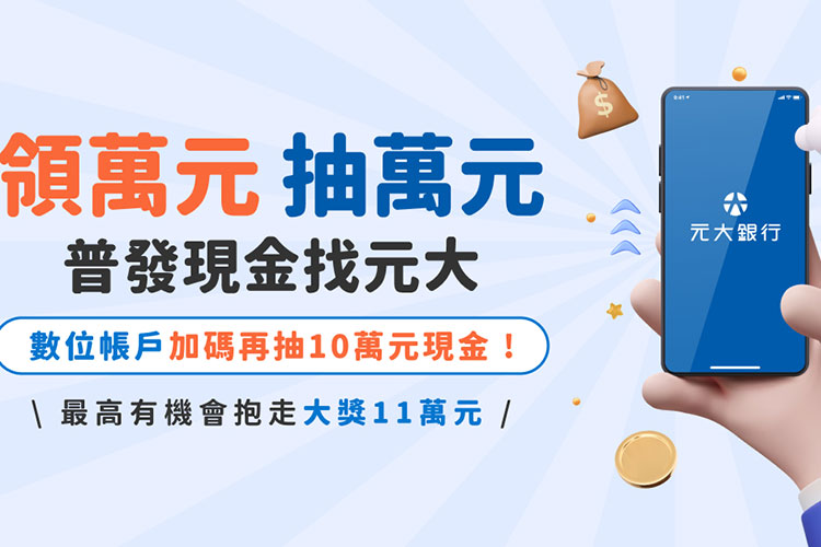 全民關注的普發現金1萬元即將登場!於11月5日開放網路預先登記,元大銀行順勢加碼最強應援「領萬元 抽萬元 普發現金找元大」活動。自2025年11月5日至2026年2月28日,民眾只要於財政部「全民+1 政府相挺」網站登記,採「登記入帳」方式,指定登記入帳至「元大銀行臺幣存款帳戶」,或是持元大銀行金融卡至全台「元大銀行ATM」領現,即可參加抽獎,有機會抽中1萬元回饋金。