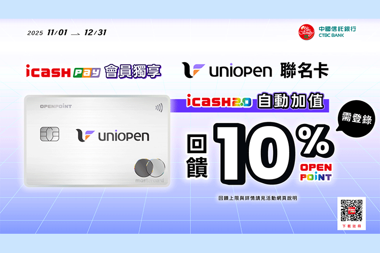 2025/11/1 ~2025/12/31,icash Pay會員於icash官網活動頁完成活動登錄,使用中國信託uniopen聯名卡icash2.0進行自動加值,即可享有10%OPENPOINT回饋,每icash Pay會員每月回饋上限50點,總上限300萬點。>>中信貸款首期年利率0.01%,最高可貸800萬