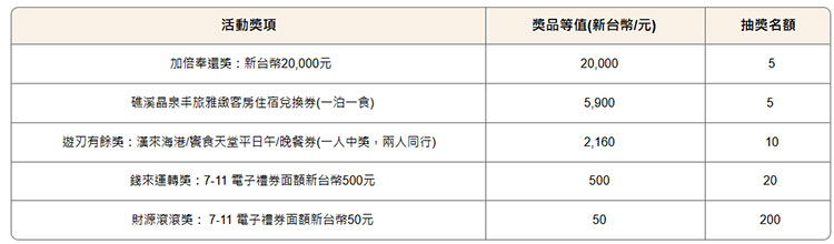(1)單筆金額達新台幣1,000元(含)以上,即可獲得1次抽獎機會,金額達新台幣2,000元(含)以上,即可獲得2次抽獎機會。金額每增加1,000元即可多1次抽獎機會,依此類推,最高可累積10次抽獎機會。(單筆一般消費金額未達新台幣1,000元(含)以上,不予計算抽獎次數)