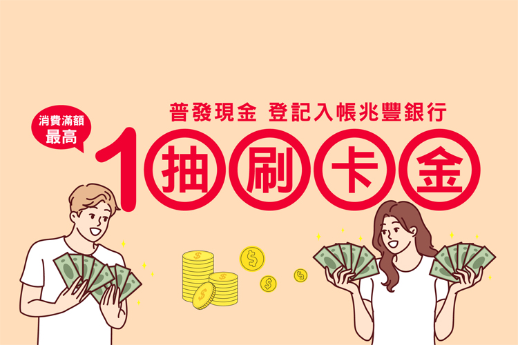 2025/11/12~2026/4/30,普發現金「登記入帳」至兆豐銀行帳戶,並持兆豐銀行信用卡新增一般消費達10,000元,享抽獎機會一次。