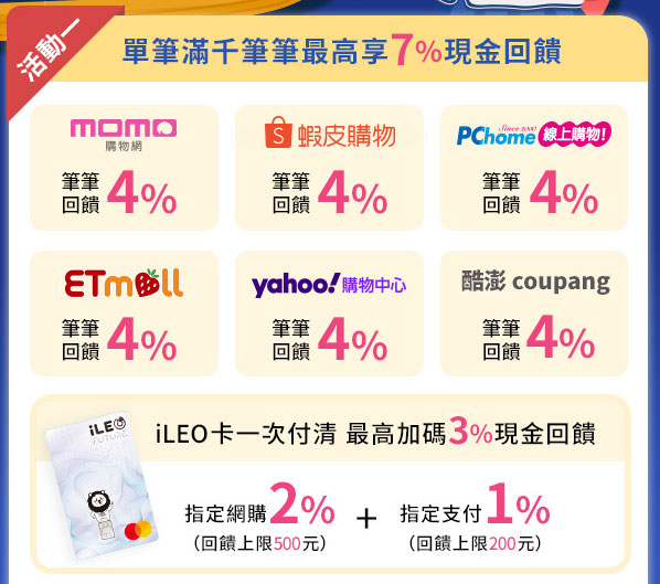 ●活動內容:活動期間內首次申辦iLEO信用卡之新戶,申辦iLEO數位帳戶扣繳與電子帳單,享核卡後90天內: