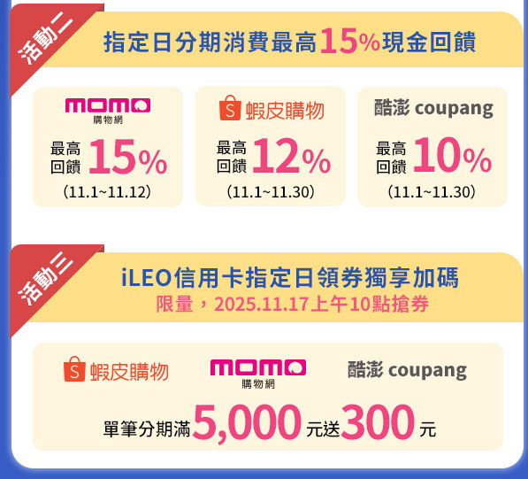 ●活動內容:雙11、雙12刷一銀卡一次付清最高7% / 分期最高15%回饋