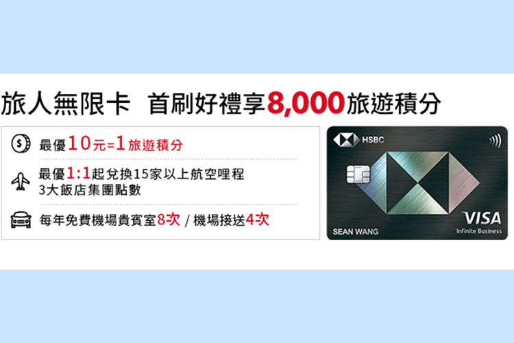 滙豐旅人無限卡核卡後30天內首次刷卡消費達10,000元並登入滙豐銀行信用卡行動App(HSBC Card+),即享消費好禮8,000旅遊積分。