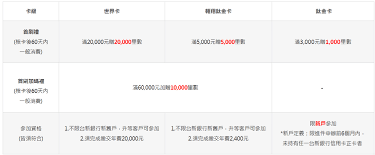 1.世界卡限申辦日往前推算6個月內未持國泰航空世界卡正卡者,翱翔鈦金卡限申辦日往前推算6個月未持國泰航空翱翔鈦金卡正卡者,始符合首刷禮活動參加資格。若申辦世界卡與翱翔鈦金卡,須完成繳交年費。鈦金卡新戶係指申辦前6個月內未持任一台新銀行信用卡正卡者。