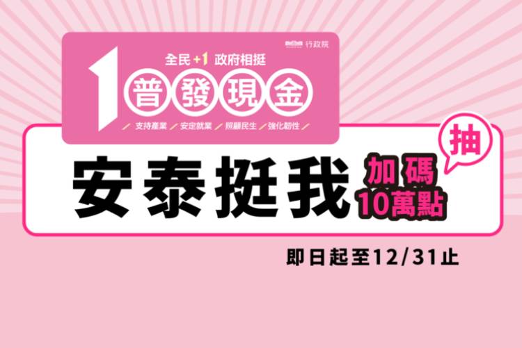 響應政府普發新台幣一萬元政策,安泰銀行推出「安泰挺我加碼抽10萬點」活動,選定安泰台幣活期存款帳戶(含數位存款帳戶) 「登記入帳」於2025/12/31前入帳成功,並綁定安泰銀行官方LINE@加碼抽紅利點數10萬點(5名)。