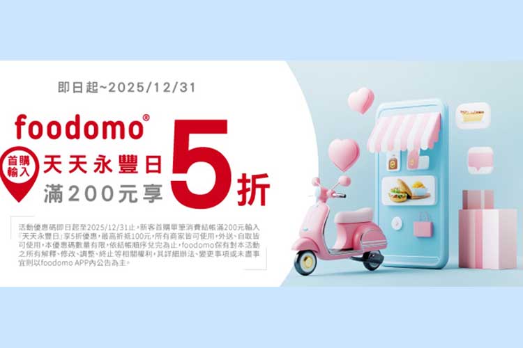 即日起~2025/12/31持永豐銀行信用卡於foodomo消費,【新客首購】單筆消費結帳滿200元,輸入優惠代碼「天天永豐日」,享5折優惠,最高折抵100元。>>永豐數時貸-手續費最優0元,最高可貸800萬