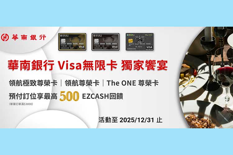 即日起至2025/12/31 持華南銀行VISA無限卡(領航極致尊榮卡、領航尊榮卡、THE ONE尊榮卡)於EZTABLE專屬頁面預付訂位餐廳,單筆滿3,000元享最高500 EZCASH回饋。