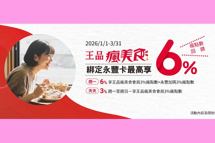 2026/1/1-2026/3/31 活動期間於王品集團旗下實體餐廳消費,使用王品瘋美食「瘋Pay」電子錢包綁定永豐銀行信用卡支付,最高享6%瘋點數回饋。