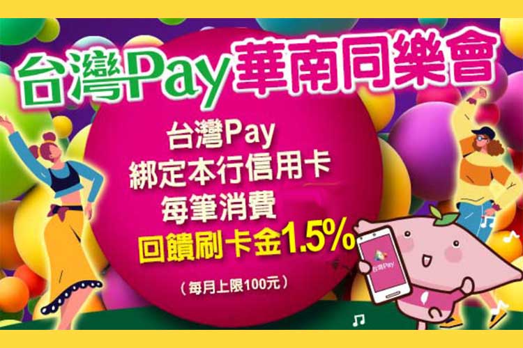 2026/1/1~2026/12/31於台灣Pay(含華銀支付或台灣行動支付App)綁定華南銀行信用卡,進行掃碼之一般消費交易可享1.5%現金回饋,每戶每月回饋上限新台幣100元,每月限量5,000戶(正、附卡分別計算歸戶)。