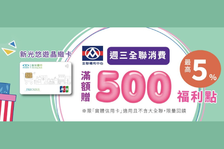 2026/01/01~2026/06/30,每週三持新光悠遊晶緻卡於全台全聯門市,單筆消費滿1,000元贈500福利點。(每週每福利卡會員限贈一次,每月限量625份,送完即止;活動期間共限量3,750份)
