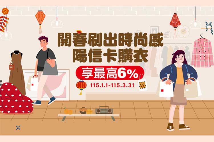 2026/1/1~2026/3/31持陽信銀行信用卡至台灣Uniqlo當月消費累積滿2000元,登錄享6%刷卡金回饋。