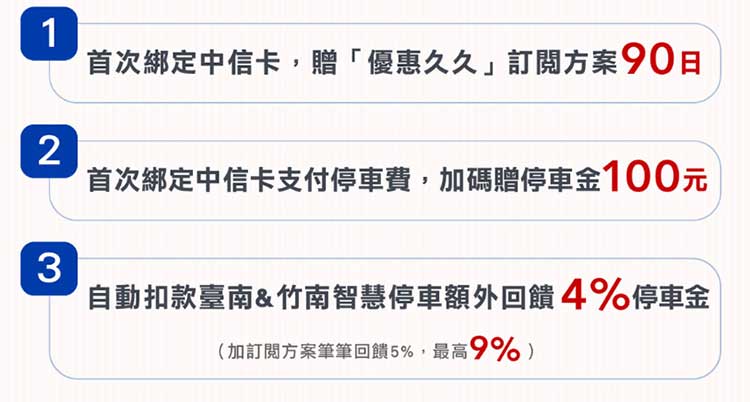 2026/1/1~2026/6/30使用停車大聲公APP綁定中國信託信用卡享以下優惠:
