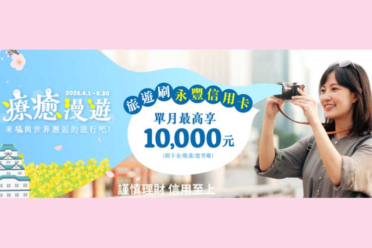 2026/4/1-2026/6/30持永豐銀行信用卡持卡人且完成登錄者,於特選旅行社、旅遊平台、航空及免稅店單月累計或分期滿額享刷卡金回饋,每戶單月最高回饋10,000元刷卡金。>>永豐數時貸-手續費最優0元,最高可貸800萬