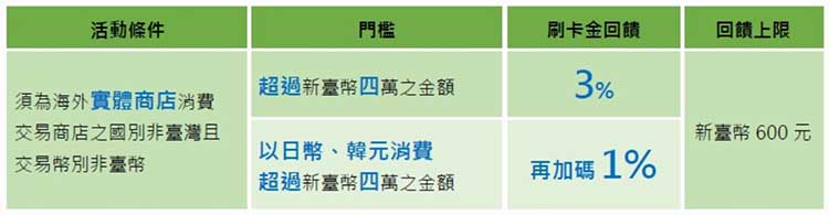 ※回饋活動係針對海外實體商店消費滿額換算新臺幣後,就超過新臺幣四萬元之部分進行回饋,非整筆累積消費金額回饋。