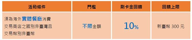 ※回饋活動係針對海外實體餐廳消費換算新臺幣後,依其收單機構設定之商店類別代碼商家類別代碼(Merchant Category Code)之餐廳分類代號MCC code為5811、5812、5813、5814者。