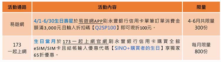3.海外餐廳消費加碼10%,再享專屬優惠碼活動限制生日壽星當月登錄,非壽星登錄無效。活動限量登錄1,000名壽星,正附卡消費合併計算,以正卡人生日月為準,正卡人當月壽星之正附卡合併消費回饋上限共新臺幣300元。回饋以新臺幣回饋至持卡人信用卡帳上。