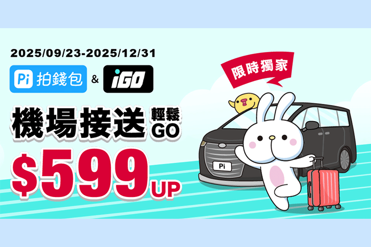 2025/09/23(二)~ 2025/12/31(三)透過 Pi 拍錢包APP前往iGO獨家合作頁面預訂機場接送服務享以下優惠: