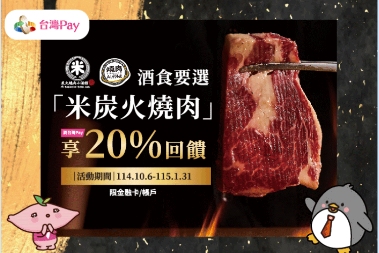 2025/10/06 - 2026/01/31至米炭火燒肉品牌受理「台灣Pay」之指定門市,使用「台灣Pay」QR Code 掃碼進行支付 (金融卡/帳戶),單筆消費不限金額可享20%現金回饋,每一金融卡/帳戶於活動期間內回饋最高以新臺幣500元為限,活動回饋總金額上限55萬元。
