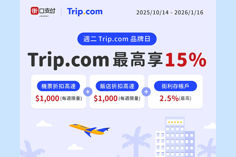 2025/10/14~2026/1/16 每週二至「Trip.com官網/App」使用街口支付輸入優惠代碼付款享以下優惠: