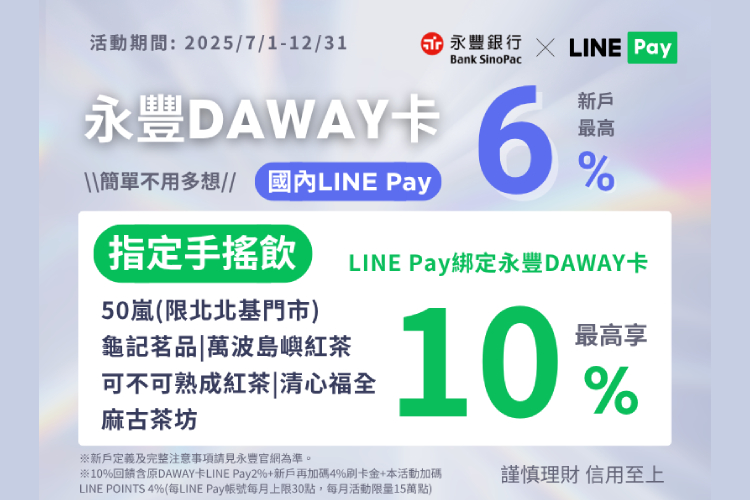 即日起~2025/12/31,於指定茶飲品牌消費,結帳時透過LINE Pay並使用已綁定的永豐DAWAY卡付款,享最高LINE POINTS 6%回饋。
